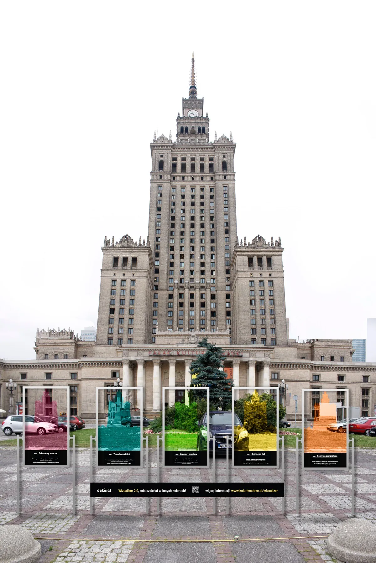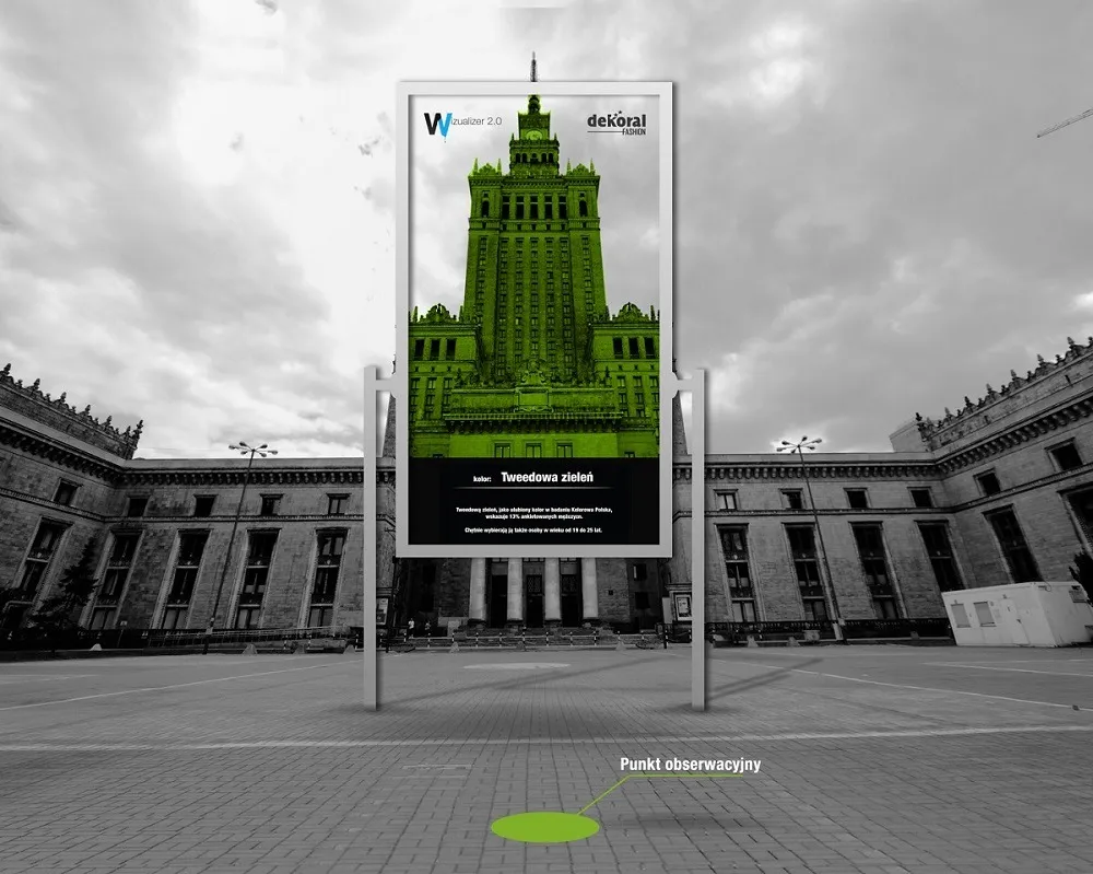 Dekoral przygotował niestandardową akcję promocyjną właśnie z myślą o aplikacji Wizualizer 2.0 Dekoral. Podczas ambientu trwającego w dniach 30 i 31 sierpnia (weekend) Dekoral „przemaluje” Pałac Kultury i Nauki w Warszawie na 5 kolorów. Instalacja przygotowana przez firmę Dekoral będzie umożliwiała zobaczenie jak PKIN wygląda w 1 z 5 kolorów pochodzących z palety Dekoral. W instalacji prezentowane będą informacje odnośnie wybranych kolorów nawiązujące do ogólnopolskiej akcji badawczej Kolorowa Polska zrealizowanej przez Dekoral Fashion, eksperta numer 1 w dziedzinie kolorów na polskim rynku.