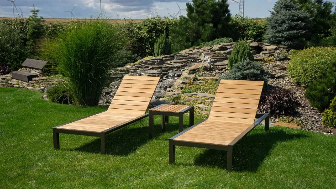 Na zdjęciu: leżaki aluminiowe, z drewnianymi oparciami. Fot. Ogrodosfera