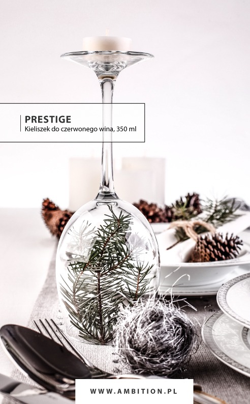 do czerwonego wina wypełniono dla dekoracji naturalnym igliwiem, a na jego odwróconej nóżce umieszczono świeczkę typu tea-light.