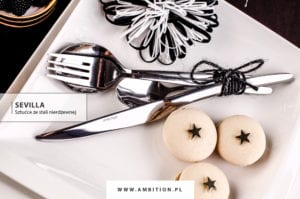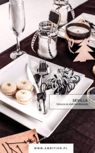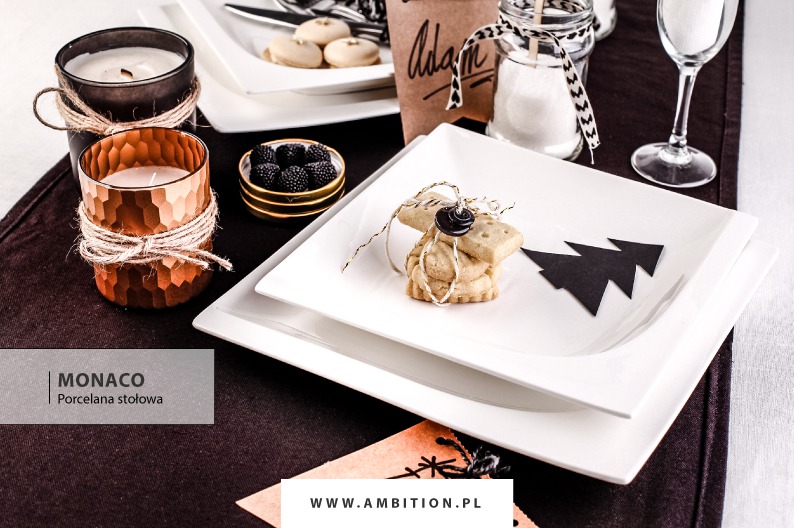 Dla miłośników stonowanej kolorystyki i prostych kształtów powstała propozycja aranżacji z udziałem porcelany Monaco. Kwadratowa forma tej zastawy stołowej z półkolistym wgłębieniem wprowadza matematyczny porządek na stole, który przełamano charakterystyczną kolekcją sztućców Sevilla o wyjątkowo smukłych rączkach. Przewiązano je czarną włóczką korespondującą z tłem bieżnika stołowego. Porcelana Monaco