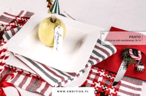 Można poczuć się jak w górskiej chacie! „Cottage” to styl wykorzystujący motywy ludowe, naturalne materiały, samodzielnie wykonane dekoracje przywodzące na myśl ręczne robótki z dzieciństwa. Czerwona krata na obrusie przenosi nas prawie do domu Świętego Mikołaja. Zastawa stołowa Fala z oryginalną falistą linią wpisała się w koncepcję „cottage” idealnie! Udekorowana na powitanie gości naturalnym dodatkiem w postaci czerwonych i żółtych jabłek nabrała wesołego charakteru. Owoce posłużyły jako stojaki na wizytówki stołowe. Szklanki Prestige z rurkami ze świątecznym motywem czerwono-białych pasków podkreśliły nieformalną odsłonę stołu, przy którym każdy może przyjemnie poczuć się jak dziecko.