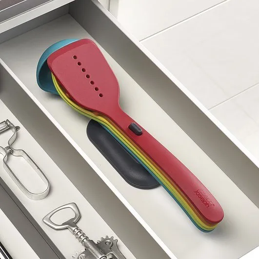 Wiele osób jest przyzwyczajanych do tego, że łyżki i szpatułki do gotowania wiszą na specjalnych haczykach lub… poniewierają się w szufladach, przez co trudno je znaleźć. W tym drugim przypadku jest na to sposób – zestaw narzędzi kuchennych na nietypowym stojaku, który jest przeznaczony do umieszczenia go w półce. Dzięki temu łyżki i chochelki znajdują się w jednym miejscu i zawsze są pod ręką.