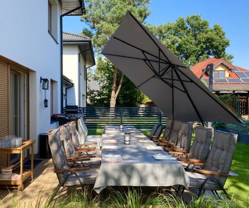 Częsty wybór na początek to parasol przeciwsłoneczny. To najtańsze rozwiązanie, które daje najmniejszą ochronę przed słońcem i deszczem z uwagi na swoją wielkość i konstrukcję. Chroni tylko tam, gdzie go ustawimy. Mobilność i łatwość montażu dla wielu osób jest zaletą, ale warto pamiętać, że takie zadaszenie może nie wytrzymać naporu mocniejszego wiatru i jest to rozwiązanie sezonowe.