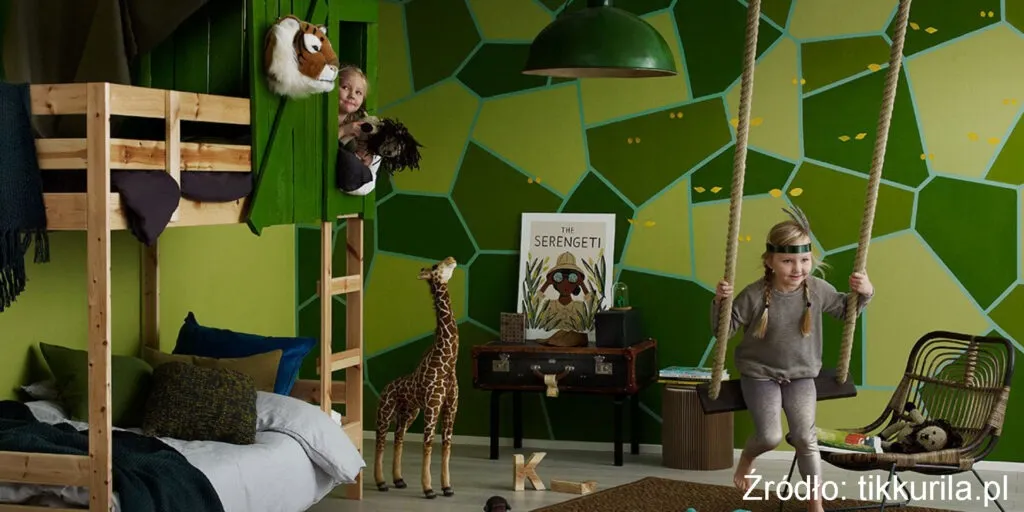 Podzwrotnikowy las jest popularną scenerią tzw. “przygodówek”. Aranżacja oparta na takich motywach z gier będzie nie tylko estetyczna, ale także uniwersalna – urban jungle jest zawsze w modzie! Na stronie Tikkurila z inspiracjami aranżacyjnymi pokojów dziecięcych znajduje się kompletny poradnik, dzięki któremu stworzycie na ścianie tropikalny wzór z wykorzystaniem zielonych odcieni z palety Tikkurila Kids Style oraz przy pomocy złotej farby Tikkurila Taika Pearl Paint. Warto rozważyć także użycie farby tablicowej Tikkurila Liitu – możliwość rysowania bezpośrednio na jej powierzchni sprawi, że wyobraźnia dziecka szybko zaludni dżunglę niesamowitymi postaciami.