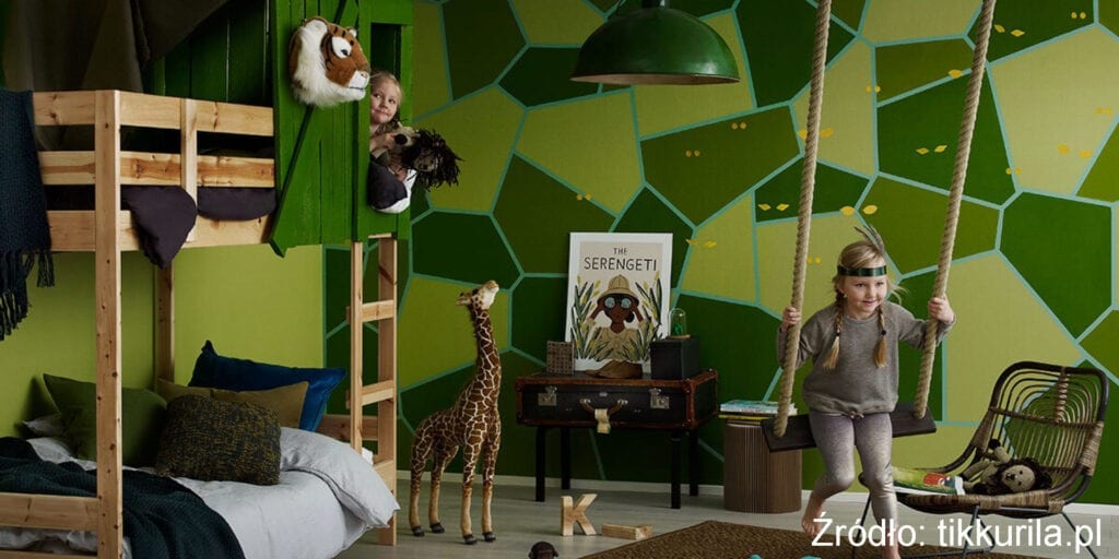 Podzwrotnikowy las jest popularną scenerią tzw. “przygodówek”. Aranżacja oparta na takich motywach z gier będzie nie tylko estetyczna, ale także uniwersalna – urban jungle jest zawsze w modzie! Na stronie Tikkurila z inspiracjami aranżacyjnymi pokojów dziecięcych znajduje się kompletny poradnik, dzięki któremu stworzycie na ścianie tropikalny wzór z wykorzystaniem zielonych odcieni z palety Tikkurila Kids Style oraz przy pomocy złotej farby Tikkurila Taika Pearl Paint. Warto rozważyć także użycie farby tablicowej Tikkurila Liitu – możliwość rysowania bezpośrednio na jej powierzchni sprawi, że wyobraźnia dziecka szybko zaludni dżunglę niesamowitymi postaciami.